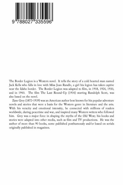 The Border Legion is a Western novel. It tells the story of a cold hearted man named Jack Kells who falls in love with Miss Joan Randle, a girl his legion has taken captive near the Idaho border. The Border Legion was adapted to film, in 1918, 1924, 1930, and in 1940. The film The Last Round-Up (1934) starring Randolph Scott, was also based on the novel. Zane Grey (1872-1939) was an American author best known for his popular adventure novels and stories that were a basis for the Western genre in literature and the arts. With his veracity and emotional intensity, he connected with millions of readers worldwide, during peacetime and war, and inspired many Western writers who followed him. Grey was a major force in shaping the myths of the Old West; his books and stories were adapted into other media, such as film and TV productions. He was the author of more than 90 books, some published posthumously and/or based on serials originally published in magazines.