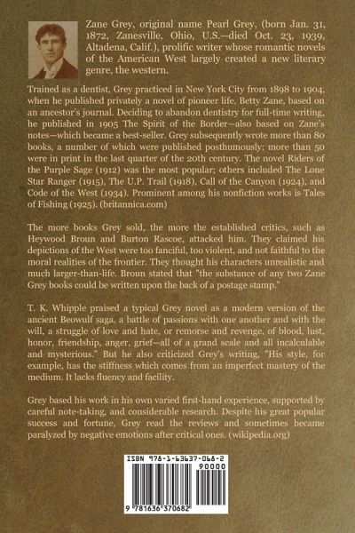 Zane Grey, original name Pearl Grey, (born Jan. 31, 1872, Zanesville, Ohio, U.S.—died Oct. 23, 1939, Altadena, Calif.), prolific writer whose romantic novels of the American West largely created a new literary genre, the western. Trained as a dentist, Grey practiced in New York City from 1898 to 1904, when he published privately a novel of pioneer life, Betty Zane, based on an ancestor’s journal. Deciding to abandon dentistry for full-time writing, he published in 1905 The Spirit of the Border—also based on Zane’s notes—which became a best-seller. Grey subsequently wrote more than 80 books, a number of which were published posthumously; more than 50 were in print in the last quarter of the 20th century. The novel Riders of the Purple Sage (1912) was the most popular; others included The Lone Star Ranger (1915), The U.P. Trail (1918), Call of the Canyon (1924), and Code of the West (1934). Prominent among his nonfiction works is Tales of Fishing (1925). (britannica.com) The more books Grey sold, the more the established critics, such as Heywood Broun and Burton Rascoe, attacked him. They claimed his depictions of the West were too fanciful, too violent, and not faithful to the moral realities of the frontier. They thought his characters unrealistic and much larger-than-life. Broun stated that "the substance of any two Zane Grey books could be written upon the back of a postage stamp." T. K. Whipple praised a typical Grey novel as a modern version of the ancient Beowulf saga, a battle of passions with one another and with the will, a struggle of love and hate, or remorse and revenge, of blood, lust, honor, friendship, anger, grief—all of a grand scale and all incalculable and mysterious." But he also criticized Grey's writing, "His style, for example, has the stiffness which comes from an imperfect mastery of the medium. It lacks fluency and facility. Grey based his work in his own varied first-hand experience, supported by careful note-taking, and considerable research. Despite his great popular success and fortune, Grey read the reviews and sometimes became paralyzed by negative emotions after critical ones. (wikipedia.org)