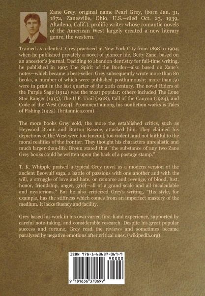Zane Grey, original name Pearl Grey, (born Jan. 31, 1872, Zanesville, Ohio, U.S.--died Oct. 23, 1939, Altadena, Calif.), prolific writer whose romantic novels of the American West largely created a new literary genre, the western. Trained as a dentist, Grey practiced in New York City from 1898 to 1904, when he published privately a novel of pioneer life, Betty Zane, based on an ancestor's journal. Deciding to abandon dentistry for full-time writing, he published in 1905 The Spirit of the Border--also based on Zane's notes--which became a best-seller. Grey subsequently wrote more than 80 books, a number of which were published posthumously; more than 50 were in print in the last quarter of the 20th century. The novel Riders of the Purple Sage (1912) was the most popular; others included The Lone Star Ranger (1915), The U.P. Trail (1918), Call of the Canyon (1924), and Code of the West (1934). Prominent among his nonfiction works is Tales of Fishing (1925). (britannica.com) The more books Grey sold, the more the established critics, such as Heywood Broun and Burton Rascoe, attacked him. They claimed his depictions of the West were too fanciful, too violent, and not faithful to the moral realities of the frontier. They thought his characters unrealistic and much larger-than-life. Broun stated that "the substance of any two Zane Grey books could be written upon the back of a postage stamp." T. K. Whipple praised a typical Grey novel as a modern version of the ancient Beowulf saga, a battle of passions with one another and with the will, a struggle of love and hate, or remorse and revenge, of blood, lust, honor, friendship, anger, grief--all of a grand scale and all incalculable and mysterious." But he also criticized Grey's writing, "His style, for example, has the stiffness which comes from an imperfect mastery of the medium. It lacks fluency and facility. Grey based his work in his own varied first-hand experience, supported by careful note-taking, and considerable research. Despite his great popular success and fortune, Grey read the reviews and sometimes became paralyzed by negative emotions after critical ones. (wikipedia.org)
