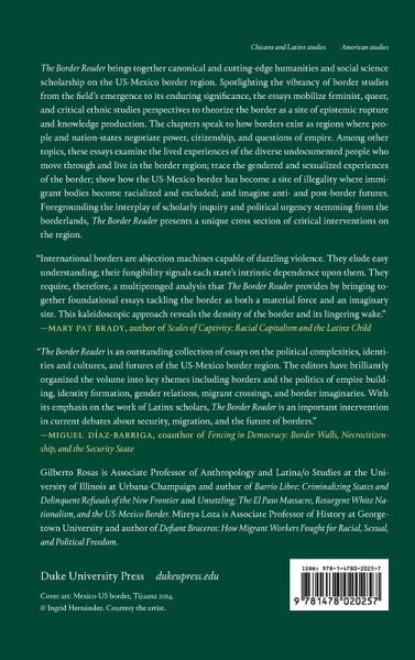 The Border Reader brings together canonical and cutting-edge humanities and social science scholarship on the US-Mexico border region. Spotlighting the vibrancy of border studies from the field's emergence to its enduring significance, the essays mobilize feminist, queer, and critical ethnic studies perspectives to theorize the border as a site of epistemic rupture and knowledge production. The chapters speak to how borders exist as regions where people and nation-states negotiate power, citizenship, and questions of empire. Among other topics, these essays examine the lived experiences of the diverse undocumented people who move through and live in the border region; trace the gendered and sexualized experiences of the border; show how the US-Mexico border has become a site of illegality where immigrant bodies become racialized and excluded; and imagine anti- and post-border futures. Foregrounding the interplay of scholarly inquiry and political urgency stemming from the borderlands, The Border Reader presents a unique cross section of critical interventions on the region. Contributors. Leisy J. Abrego, Gloria E. Anzaldúa, Martha Balaguera, Lionel Cantú, Leo R. Chavez, Raúl Fernández, Rosa-Linda Fregoso, Roberto G. Gonzales, Gilbert G. González, Ramón Gutiérrez, Kelly Lytle Hernández, José E. Limón, Mireya Loza, Alejandro Lugo, Eithne Luibhéid, Martha Menchaca, Cecilia Menjívar, Natalia Molina, Fiamma Montezemolo, Américo Paredes, Néstor Rodríguez, Renato Rosaldo, Gilberto Rosas, María Josefina Saldaña-Portillo, Sonia Saldívar-Hull, Alicia Schmidt Camacho, Sayak Valencia Triana, Carlos G. Vélez-Ibáñez, Patricia Zavella