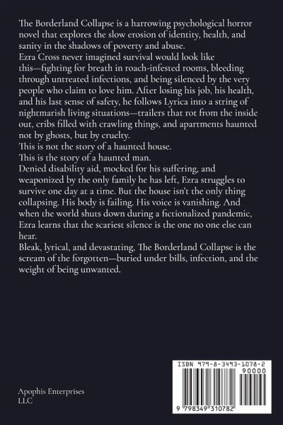 The Borderland Collapse is a harrowing psychological horror novel that explores the slow erosion of identity, health, and sanity in the shadows of poverty and abuse. Ezra Cross never imagined survival would look like this-fighting for breath in roach-infested rooms, bleeding through untreated infections, and being silenced by the very people who claim to love him. After losing his job, his health, and his last sense of safety, he follows Lyrica into a string of nightmarish living situations-trailers that rot from the inside out, cribs filled with crawling things, and apartments haunted not by ghosts, but by cruelty. This is not the story of a haunted house. This is the story of a haunted man. Denied disability aid, mocked for his suffering, and weaponized by the only family he has left, Ezra struggles to survive one day at a time. But the house isn't the only thing collapsing. His body is failing. His voice is vanishing. And when the world shuts down during a fictionalized pandemic, Ezra learns that the scariest silence is the one no one else can hear. Bleak, lyrical, and devastating, The Borderland Collapse is the scream of the forgotten-buried under bills, infection, and the weight of being unwanted.