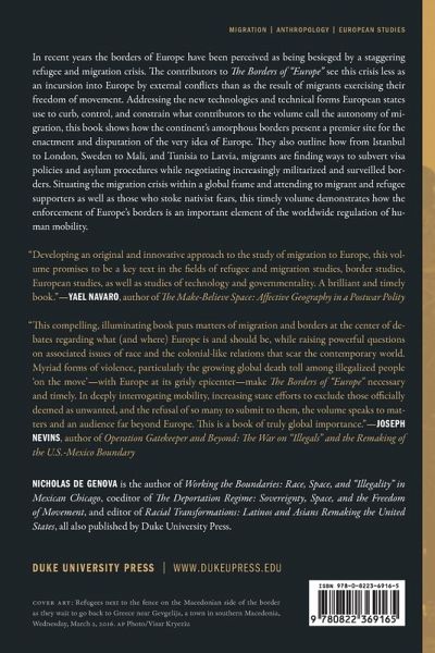In recent years the borders of Europe have been perceived as being besieged by a staggering refugee and migration crisis. The contributors to The Borders of "Europe" see this crisis less as an incursion into Europe by external conflicts than as the result of migrants exercising their freedom of movement. Addressing the new technologies and technical forms European states use to curb, control, and constrain what contributors to the volume call the autonomy of migration, this book shows how the continent's amorphous borders present a premier site for the enactment and disputation of the very idea of Europe. They also outline how from Istanbul to London, Sweden to Mali, and Tunisia to Latvia, migrants are finding ways to subvert visa policies and asylum procedures while negotiating increasingly militarized and surveilled borders. Situating the migration crisis within a global frame and attending to migrant and refugee supporters as well as those who stoke nativist fears, this timely volume demonstrates how the enforcement of Europe's borders is an important element of the worldwide regulation of human mobility. Contributors. Ruben Andersson, Nicholas De Genova, Dace Dzenovska, Evelina Gambino, Glenda Garelli, Charles Heller, Clara Lecadet, Souad Osseiran, Lorenzo Pezzani, Fiorenza Picozza, Stephan Scheel, Maurice Stierl, Laia Soto Bermant, Martina Tazzioli