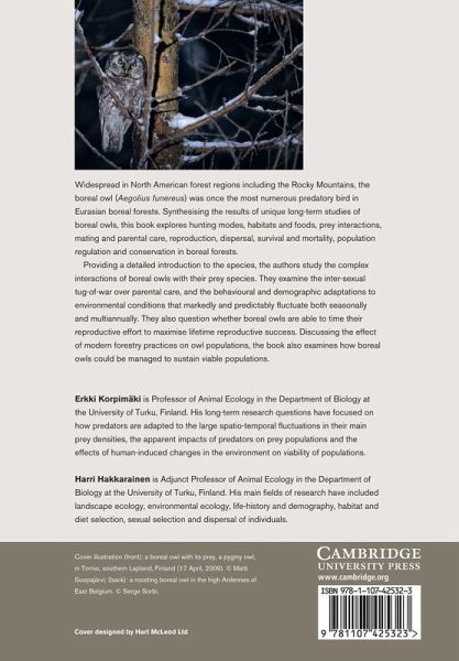 Widespread in North American forest regions including the Rocky Mountains, the Boreal Owl (Aegolius funereus) was once the most numerous predatory bird in Eurasian boreal forests. Synthesising the results of unique long-term studies of Boreal Owls, this book explores hunting modes, habitats and foods, prey interactions, mating and parental care, reproduction, dispersal, survival and mortality, population regulation and conservation in boreal forests. Providing a detailed introduction to the species, the authors study the complex interactions of Boreal Owls with their prey species. They examine the inter-sexual tug-of-war over parental care, and the behavioural and demographic adaptations to environmental conditions that predictably and markedly fluctuate both seasonally and multi-annually. They also question whether Boreal Owls are able to time their reproductive effort to maximise lifetime reproductive success. Discussing the effect of modern forestry practices on owl populations, the book also examines how Boreal Owls could be managed to sustain viable populations.