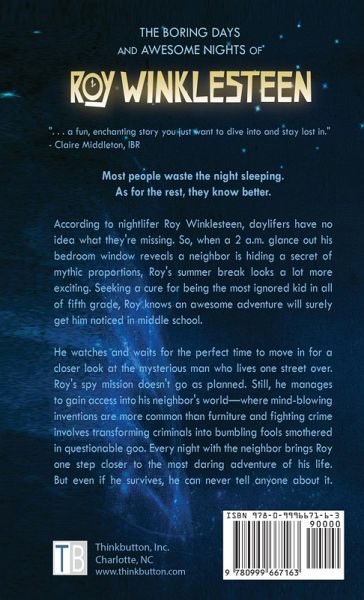The first book in the Roy Winklesteen Series. A touching middle-grade adventure about friendship and finding one's confidence. Most people waste the night sleeping. As for the rest, they know better. According to nightlife, Roy Winklesteen, daylifers have no idea what they're missing. So, when a 2 a.m. glance out his bedroom window reveals a neighbor is hiding a secret of mythic proportions, Roy's summer break looks a lot more exciting. Seeking a cure for being the most ignored kid in all of fifth grade, Roy knows an awesome adventure will surely get him noticed in middle school. He watches and waits for the perfect time to move in for a closer look at the mysterious man who lives one street over. Roy's spy mission doesn't go as planned. Still, he manages to gain access into his neighbor's world-where mind-blowing inventions are more common than furniture and fighting crime involves transforming criminals into bumbling fools smothered in questionable goo. Every night with the neighbor brings Roy one step closer to the most daring adventure of his life. But even if he survives, he can never tell anyone about it.