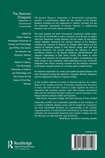'In this excellent collection of articles on Bosnian migrants, the authors illustrate the complex processes of boundary drawing that take place as those who have left their country of origin negotiate the terms of integration into receiving countries while often forging transnational links with the homeland. Essential reading for anyone interested in the linkage between political conflict and migration.' Peter Kivisto, Augustana College, USA and University of Turku, Finland 'Empirically excellent and analytically compelling on the emergence of a modern worldwide diaspora group and its struggle for acceptance, this book substantially broadens our understanding of the complex migration process. It vividly describes how Bosnians are being culturally, politically and economically shaped by host societies' realities, but also how Bosnians are affecting their "new homelands".' Nihad Bunar, Stockholm University, Sweden 'Overall this collection provides the reader with food for thought about productive ways to theorize ethnicity through processes of boundary making in a way that disentangles analysis from the enduring legacy of discrete and observable entities, but also ways of assessing the value of transnationalism as a conceptual tool. The contribution of original empirical studies on the Bosnian diaspora in a variety of diverse locales is a welcome addition to the small body of Literature... the wealth of data and insight contained in its pages make it a valuable ethnographic and conceptual contribution to contemporary scholarship on transnationalism, diaspora and post-Yugoslav diasporas.' Südosteuropa '... a welcome follow-up volume to a large research output on the Bosnian war and refugee outflows that was published from the mid-1990s to the early 2000s... overall this is a useful, accessible, interesting, and diverse volume.' Contemporary Sociology 'This book presents the first comprehensive analysis of the integration and transnationalism of the Bosnian dia