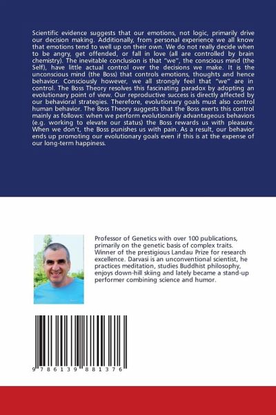 Scientific evidence suggests that our emotions, not logic, primarily drive our decision making. Additionally, from personal experience we all know that emotions tend to well up on their own. We do not really decide when to be angry, get offended, or fall in love (all are controlled by brain chemistry). The inevitable conclusion is that "we", the conscious mind (the Self), have little actual control over the decisions we make. It is the unconscious mind (the Boss) that controls emotions, thoughts and hence behavior. Consciously however, we all strongly feel that "we" are in control. The Boss Theory resolves this fascinating paradox by adopting an evolutionary point of view. Our reproductive success is directly affected by our behavioral strategies. Therefore, evolutionary goals must also control human behavior. The Boss Theory suggests that the Boss exerts this control mainly as follows: when we perform evolutionarily advantageous behaviors (e.g. working to elevate our status) theBoss rewards us with pleasure. When we don't, the Boss punishes us with pain. As a result, our behavior ends up promoting our evolutionary goals even if this is at the expense of our long-term happiness.