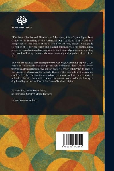 "The Boston Terrier and All About It: A Practical, Scientific, and Up to Date Guide to the Breeding of the American Dog" by Edward A. Axtell is a comprehensive exploration of the Boston Terrier breed, presented as a guide to responsible dog breeding and animal husbandry. This meticulously prepared republication offers insights into the historical practices surrounding the breed, reflecting the scientific understanding and popular culture of the time. Explore the nuances of breeding these beloved dogs, examining aspects of pet care and responsible ownership through a historical lens. Axtell's work provides a detailed perspective on the Boston Terrier, solidifying its place in the lineage of American dog breeds. Discover the methods and techniques employed by breeders of the era, offering a unique look at the evolution of animal husbandry. A valuable resource for anyone interested in the history of dog breeding or the specifics of the Boston Terrier's origins. This work has been selected by scholars as being culturally important, and is part of the knowledge base of civilization as we know it. This work is in the public domain in the United States of America, and possibly other nations. Within the United States, you may freely copy and distribute this work, as no entity (individual or corporate) has a copyright on the body of the work. Scholars believe, and we concur, that this work is important enough to be preserved, reproduced, and made generally available to the public. We appreciate your support of the preservation process, and thank you for being an important part of keeping this knowledge alive and relevant.