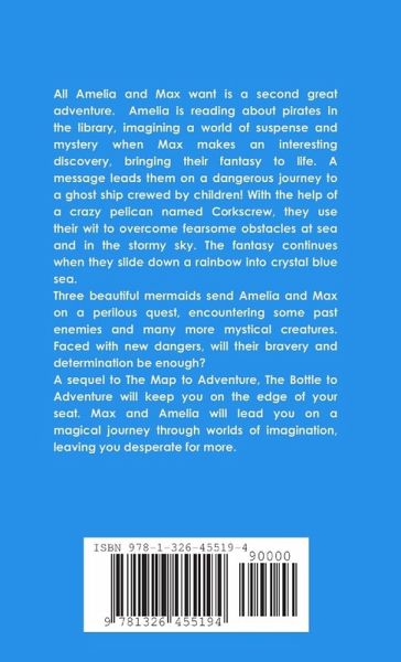 All Amelia and Max want is a second great adventure. Amelia is reading about pirates in the library, imagining a world of suspense and mystery when Max makes an interesting discovery, bringing their fantasy to life. A message leads them on a dangerous journey to a ghost ship crewed by children! With the help of a crazy pelican named Corkscrew, they use their wit to overcome fearsome obstacles at sea and in the stormy sky. The fantasy continues when they slide down a rainbow into crystal blue sea. Three beautiful mermaids send Amelia and Max on a perilous quest, encountering some past enemies and many more mystical creatures. Faced with new dangers, will their bravery and determination be enough? A sequel to The Map to Adventure, The Bottle to Adventure will keep you on the edge of your seat. Max and Amelia will lead you on a magical journey through worlds of imagination, leaving you desperate for more.