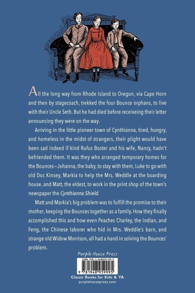 All the long way from Rhode Island to Oregon, via Cape Horn and then by stagecoach, trekked the four Bounce orphans, to live with their Uncle Seth. But he had died before receiveing their letter announcing they were on the way. Arriving in the little pioneer town of Cynthianna, tired, hungry, and homeless in the midst of strangers, their plight would have been sad indeed if kind Rufus Boster and his wife, Nancy, hadn't befriended them. It was they who arranged temporary homes for the Bounces-Johanna, the baby, to stay with them, Luke to go with old Doc Kinsey, Markia to help the Mrs. Weddle at the boarding house, and Matt, the eldest, to work in the print shop of the town's newspaper the Cynthianna Shield. Matt and Markia's big problem was to fulfill the promise to their mother, keeping the Bounces together as a family. How they finally accomplished this and how even Peaches Charley, the Indian, and Feng, the Chinese laborer who hid in Mrs. Weddle's barn, and strange old Widow Morrison, all had a hand in solving the Bounces' problem. Evelyn Sibley Lampman, author of The Shy Stegosaurus books, City Under the Back Steps, Three Knocks on the Wall and Bargain Bride, tells an absorbing and entertaining story-and Grace Paull's numerous pictures make the Bounces and their neighbors real and unforgettable people.