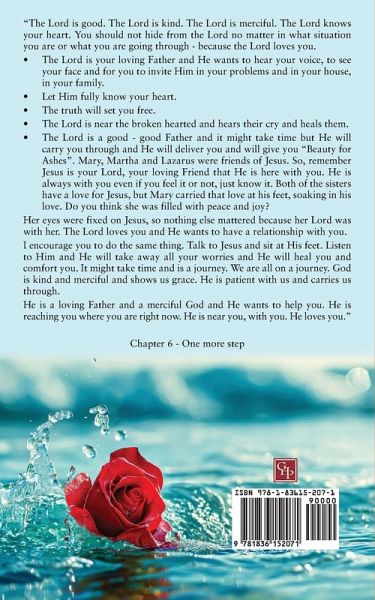 The Boundaries of my Heart - Beauty for Ashes - is a Fictional, Christian, Romantic novel that captures the lives of Sarah and Daniel together with all their friends. Going through different circumstances in life, the main characters meet and connect through the music. They enjoy a lovely journey of Friendship. Sarah learns to forgive and let go of the past and move forward with her life, finding her identity in Christ. Daniel on the other hand dedicated to his work, always helping in church and being there for his sister learns to slow down to the point of considering a relationship. It is a beautiful story how step by step God leads both Sarah and Daniel and works at their character, circumstances and both of them enjoy developing a beautiful friendship and fall in love. "The Lord is good. The Lord is kind. The Lord is merciful. The Lord knows your heart. You should not hide from the Lord no matter in what situation you are or what you are going through - because the Lord loves you. The Lord is your loving Father and He wants to hear your voice, to see your face and for you to invite Him in your problems and in your house, in your family. Let Him fully know your heart.The truth will set you free. The Lord is near the broken hearted and hears their cry and heals them. The Lord is a good - good Father and it might take time but He will carry you through and He will deliver you and will give you "Beauty for Ashes". Mary, Martha and Lazarus were friends of Jesus. So, remember Jesus is your Lord, your loving Friend that He is here with you. He is always with you even if you feel it or not, just know it. Both of the sisters have a love for Jesus, but Mary carried that love at his feet, soaking in his love. Do you think she was filled with peace and joy? Her eyes were fixed on Jesus, so nothing else mattered because her Lord was with her. The Lord loves you and He wants to have a relationship with you. I encourage you to do the same thing. Talk to Jesus and sit at His feet. Listen to Him and He will take away all your worries and He will heal you and comfort you. It might take time and is a journey. We are all on a journey. God is kind and merciful and shows us grace. He is patient with us and carries us through. He is a loving Father and a merciful God and He wants to help you. He is reaching you where you are right now. He is near you, with you. He loves you." Chapter 6 - One more step