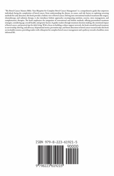 "The Bowel Cancer Mastery Bible: Your Blueprint for Complete Bowel Cancer Management" is a comprehensive guide that empowers individuals facing the complexities of bowel cancer. From understanding the disease, its causes, and risk factors to exploring screening methods for early detection, this book provides a holistic view of bowel cancer. Delving into conventional medical treatments like surgery, chemotherapy, and radiation therapy, it also introduces holistic approaches encompassing nutrition, exercise, stress management, and complementary therapies. The book emphasizes the integration of…mehr