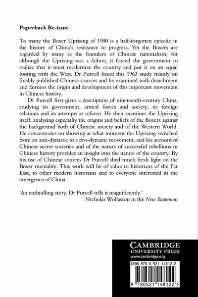 To many the Boxer Uprising of 1900 is a half-forgotten episode in the history of China's resistance to progress. Yet the Boxers are regarded by many as the founders of Chinese nationalism; for although the Uprising was a failure, it forced the government to realize that it must modernize the country and put it on an equal footing with the West. Dr Prucell based this 1963 study mainly on freshly published Chinese sources and he examined with detachment and fairness the origin and development of this important movement in Chinese history. By his use of Chinese sources Dr Purcell provides an insight into the nature of the country as well as the Boxer mentality. This work will be of value to historians of the Far East, to other modern historians and to everyone interested in the emergence of China.