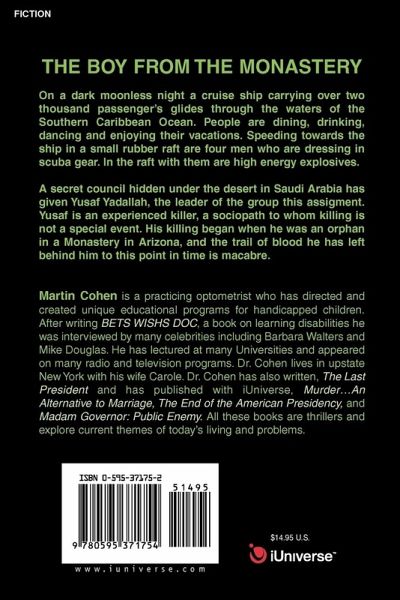 On a dark moonless night a cruise ship carrying over two thousand passenger's glides through the waters of the Southern Caribbean Ocean. People are dining, drinking, dancing and enjoying their vacations. Speeding towards the ship in a small rubber raft are four men who are dressing in scuba gear. In the raft with them are high energy explosives. A secret council hidden under the desert in Saudi Arabia has given Yusaf Yadallah, the leader of the group this assigment. Yusaf is an experienced killer, a sociopath to whom killing is not a special event. His killing began when he was an orphan in a Monastery in Arizona, and the trail of blood he has left behind him to this point in time is macabre.