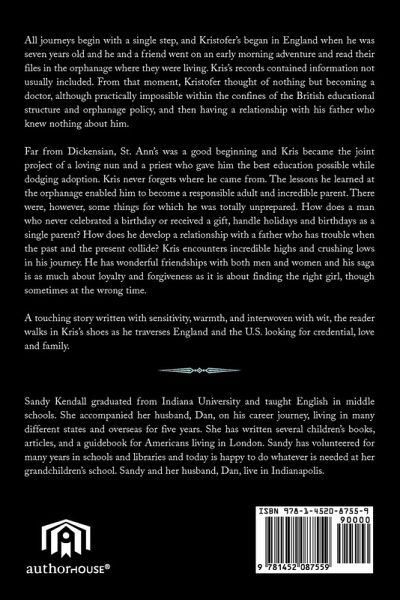 All journeys begin with a single step, and Kristofer's began in England when he was seven years old and he and a friend went on an early morning adventure and read their files in the orphanage where they were living. Kris's records contained information not usually included. From that moment, Kristofer thought of nothing but becoming a doctor, although practically impossible within the confines of the British educational structure and orphanage policy, and then having a relationship with his father who knew nothing about him. Far from Dickensian, St. Ann's was a good beginning and Kris became the joint project of a loving nun and a priest who gave him the best education possible while dodging adoption. Kris never forgets where he came from. The lessons he learned at the orphanage enabled him to become a responsible adult and incredible parent. There were, however, some things for which he was totally unprepared. How does a man who never celebrated a birthday or received a gift, handle holidays and birthdays as a single parent? How does he develop a relationship with a father who has trouble when the past and the present collide? Kris encounters incredible highs and crushing lows in his journey. He has wonderful friendships with both men and women and his saga is as much about loyalty and forgiveness as it is about finding the right girl, though sometimes at the wrong time. A touching story written with sensitivity, warmth, and interwoven with wit, the reader walks in Kris's shoes as he traverses England and the U.S. looking for credential, love and family.