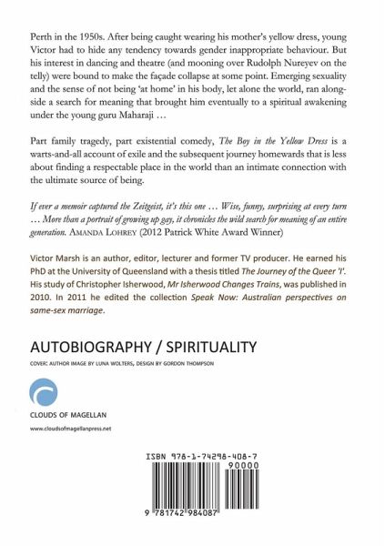 Perth in the 1950s. After being caught wearing his mother's yellow dress, young Victor had to hide any tendency towards gender inappropriate behaviour. But his interest in dancing and theatre (and mooning over Rudolph Nureyev on the telly) were bound to make the façade collapse at some point. Emerging sexuality and the sense of not being 'at home' in his body, let alone the world, ran alongside a search for meaning that brought him eventually to a spiritual awakening under the young guru Maharaji... Part family tragedy, part existential comedy, The Boy in the Yellow Dress is a warts-and-all account of exile and the subsequent journey homewards that is less about finding a respectable place in the world than an intimate connection with the ultimate source of being. "If ever a memoir captured the Zeitgeist, it's this one ... Wise, funny, surprising at every turn ... More than a portrait of growing up gay, it chronicles the wild search for meaning of an entire generation." - Amanda Lohrey (2012 Patrick White Award Winner)