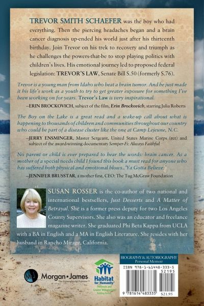 "The Boy on the Lake" is the inspirational story of how one teenager faced down two bullies: brain cancer and an emotionally abusive father. Born into a family of professional baseball and big macs, his courageous journey leads him from a small town in the mountains of Idaho to the biggest stage of all: the United States Congress where a bill he helped create awaits passage. It is called Trevor's Law. With his mother, he becomes an activist to alert those in government about the epidemic of childhood cancers and cancer clusters that are plaguing every region of our country and how to stop them.