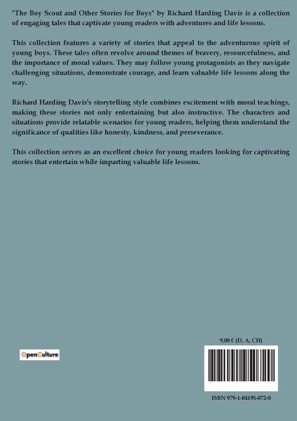 "The Boy Scout and Other Stories for Boys" by Richard Harding Davis is a collection of engaging tales that captivate young readers with adventures and life lessons. This collection features a variety of stories that appeal to the adventurous spirit of young boys. These tales often revolve around themes of bravery, resourcefulness, and the importance of moral values. They may follow young protagonists as they navigate challenging situations, demonstrate courage, and learn valuable life lessons along the way. Richard Harding Davis's storytelling style combines excitement with moral teachings, making these stories not only entertaining but also instructive. The characters and situations provide relatable scenarios for young readers, helping them understand the significance of qualities like honesty, kindness, and perseverance. This collection serves as an excellent choice for young readers looking for captivating stories that entertain while imparting valuable life lessons.