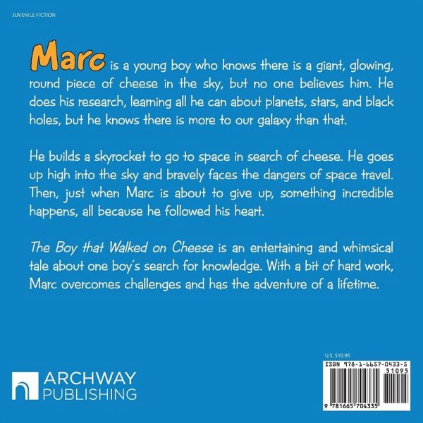 Marc is a young boy who knows there is a giant, glowing, round piece of cheese in the sky, but no one believes him. He does his research, learning all he can about planets, stars, and black holes, but he knows there is more to our galaxy than that. He builds a skyrocket to go to space in search of cheese. He goes up high into the sky and bravely faces the dangers of space travel. Then, just when Marc is about to give up, something incredible happens, all because he followed his heart. The Boy that Walked on Cheese is an entertaining and whimsical tale about one boy's search for knowledge. With a bit of hard work, Marc overcomes challenges and has the adventure of a lifetime.
