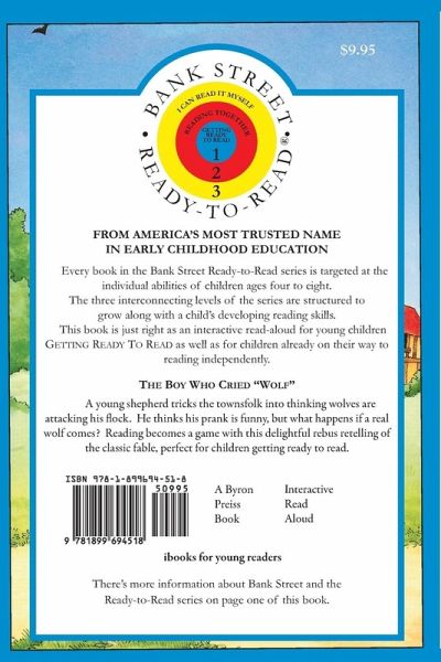 THE BOY WHO CRIED "WOLF!" A young shepherd tricks the townsfolk into thinking wolves are attacking his flock. He thinks his prank is funny, but what happens if a real wolf comes? Reading becomes a game with this delightful rebus retelling of the classic fable, perfect for children getting ready to read. ¿FROM AMERICA'S MOST TRUSTED NAME IN EARLY CHILDHOOD EDUCATION More than seventy years of educational research and innovative teaching have given the Bank Street College of Education the reputation as America's most trusted name in early childhood education. Because no two children are exactly alike in their development, we have designed the Bank Street Ready-to-Read series in three levels to accommodate the individual stages of reading readiness of children ages four through eight. • Level 1: GETTING READY TO READ- (PRE-K to GRADE 1) Books are perfect for reading aloud with children who are getting ready to read or are just beginning to read words or phrases. • Level 2: READING TOGETHER-(GRADES 1 to 3) Books are written especiallly for children who are on their way to reading independently but who may need help. • Level 3: I CAN READ IT MYSELF-(GRADES 2 to 3) Books are designed for children able to read on their own. They also can be enjoyed as read-alouds.