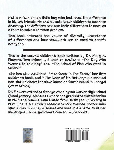 Nat is a fashionable little boy who just loves the difference in his cat friends. He and his cats teach children to embrace diversity. The different cats use their differences to work as a team to solve a common problem. This book embraces the power of diversity, acceptance of differences and how teamwork can be used to benefit everyone.