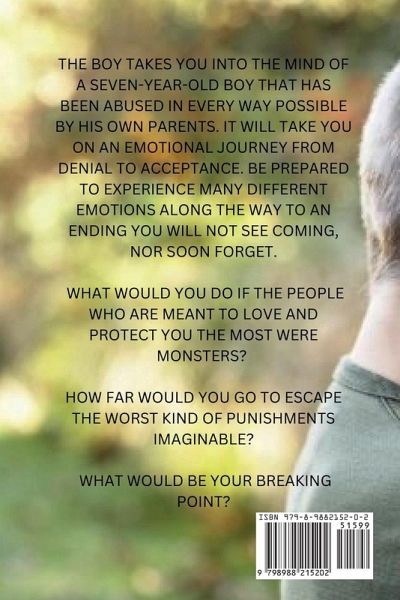 The Boy takes you into the mind of a seven-year-old boy that has been abused in every way possible by both of his parents. It will take you on an emotional journey with the boy from denial to acceptance. Be prepared to experience many different emotions along the way, leading you to an ending you will not see coming, nor soon forget. What would you do, if the people who are meant to love and protect you the most, were monsters? How far would you go, to escape the very worst kind of punishments imaginable? What would be your breaking point?