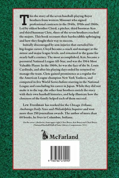 This the story of the seven baseball-playing Boyer brothers from western Missouri who signed professional contracts in the 1940s, 1950s and 1960s. Led by oldest brother Cloyd, a pitcher, third baseman Ken and third baseman Clete, three of the seven brothers reached the majors. This book recounts their hardscrabble upbringing and how they fought their way to success. Initially discouraged by arm injuries that curtailed his big-league career, Cloyd became a coach and manager at the minor and major league levels, and remained in the game for nearly half a century. The most accomplished, Ken, became a perennial National League All-Star, and was the 1964 Most Valuable Player. In the 1960s, he was the face of the St. Louis Cardinals, and after his playing days ended he returned to manage the team. Clete gained prominence as a regular for the American League champion New York Yankees, and competed in five World Series before starring in the National League and concluding his career in Japan. While they did not make it to the top, the other four brothers enrich the story with their own baseball histories, and help illustrate how the closeness of the family helped each of them succeed.