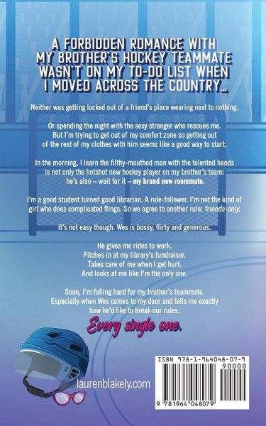 A forbidden romance with my brother's hockey-playing teammate wasn't on my to-do list when I moved across the country... I uprooted my quiet life for a new job in the city, not to spend my first evening here with a sexy stranger who rescues me when I'm locked out of my friend's apartment wearing nearly nothing. Then rescues me from an O drought. But the next morning, I learn the generous, filthy-mouthed man from last night is not only my brother's new hockey teammate. He's also - wait for it - my brand new roommate. The last thing I need is a complicated fling, and Wesley doesn't want to rock the team boat, so we agree to a friends-only rule. It's not easy though when the shameless flirt walks around the house shirtless. Or when he gives me heated looks that make my pulse pound. It's harder still to stay friendly when he offers me rides to work, pitches in at my library's fundraiser and takes care of me when I get hurt. He makes me feel seen in a way I've never experienced before. I don't know how long I can stick to our rules, especially the night Wes comes to my door and tells me exactly how he'd like to break them. Every single one.