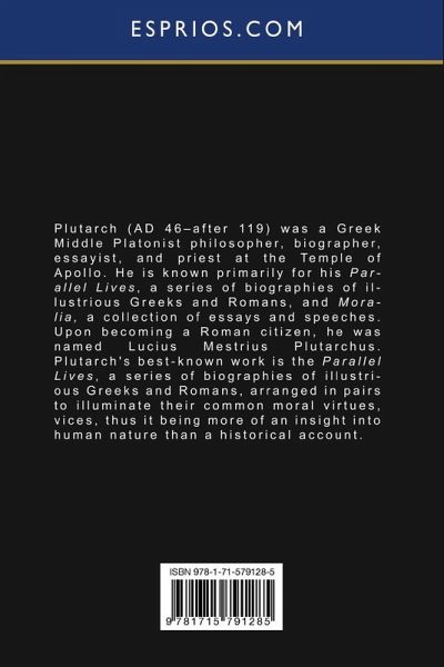 Plutarch (AD 46-after 119) was a Greek Middle Platonist philosopher, biographer, essayist, and priest at the Temple of Apollo. He is known primarily for his Parallel Lives, a series of biographies of illustrious Greeks and Romans, and Moralia, a collection of essays and speeches. Upon becoming a Roman citizen, he was named Lucius Mestrius Plutarchus. Plutarch's best-known work is the Parallel Lives, a series of biographies of illustrious Greeks and Romans, arranged in pairs to illuminate their common moral virtues, vices, thus it being more of an insight into human nature than a historical account.…mehr