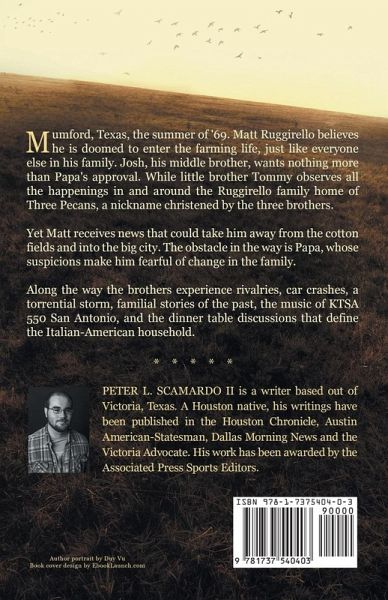 Mumford, Texas, the summer of '69. Matt Ruggirello believes he is doomed to enter the farming life, just like everyone else in his family. Josh, his middle brother, wants nothing more than Papa's approval. While little brother Tommy observes all the happenings in and around the Ruggirello family home of Three Pecans, a nickname christened by the three brothers. Yet Matt receives news that could take him away from the cotton fields and into the big city. The obstacle in the way is Papa, whose suspicions make him fearful of change in the family. Along the way the brothers experience rivalries, car crashes, a torrential storm, familial stories of the past, the music of KTSA 550 San Antonio, and the dinner table discussions that define the Italian-American household. Inspired by stories his family has told over the years, Peter L. Scamardo II provides a window into the lives of the Central Texas farming communities, and a different perspective on the Italian-American experience.