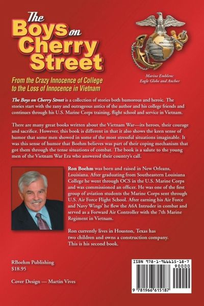 The Boys on Cherry Street is a collection of stories both humorous and heroic. The stories start with the zany and outrageous antics of the author and his college friends and continues through his U.S. Marine Corps training, flight school and service in Vietnam. There are many great books written about the Vietnam War--its heroes, their courage and sacrifice. However, this book is different in that it also shows the keen sense of humor that some men showed in some of the most stressful situations imaginable. It was this sense of humor that Boehm believes was part of their coping mechanism that got them through the tense situations of combat. The book is a salute to the young men of the Vietnam War Era who answered their country's call.