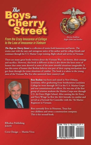 The Boys on Cherry Street is a collection of stories both humorous and heroic. The stories start with the zany and outrageous antics of the author and his college friends and continues through his U.S. Marine Corps training, flight school and service in Vietnam. There are many great books written about the Vietnam War--its heroes, their courage and sacrifice. However, this book is different in that it also shows the keen sense of humor that some men showed in some of the most stressful situations imaginable. It was this sense of humor that Boehm believes was part of their coping mechanism that got them through the tense situations of combat. The book is a salute to the young men of the Vietnam War Era who answered their country's call.