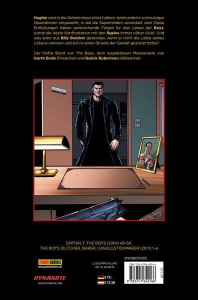 Hughie wird in die Geheimnisse eines halben Jahrhunderts schmutziger Operationen eingeweiht, in die Superhelden verwickelt sind. Diese Enthüllungen haben weitreichende Folgen für das Leben der Boys, zumal die letzte Konfrontation mit den Supies immer näher rückt. Und was wäre aus Billy Butcher geworden, wenn er nicht die Liebe seines Lebens verloren und sich in einen Strudel der Gewalt gestürzt hätte?Der fünfte Band von The Boys, den respektlosen Meisterwerk von Garth Ennis (Preacher) und Darick Robertson (Wolverine).ENTHÄLT: THE BOYS (2006) 48-59, THE BOYS: BUTCHER, BAKER, CANDLESTICKMAKER (2011) 1-6LESEEMPFEHLUNG AB 18 JAHREN!