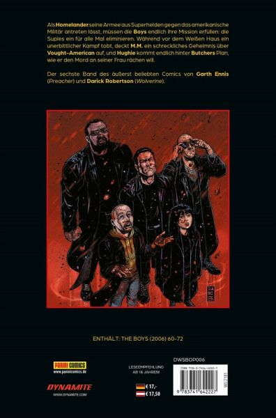 Als Homelander seine Armee aus Superhelden gegen das amerikanische Militär antreten lässt, müssen die Boys endlich ihre Mission erfüllen: die Supies ein für alle Mal eliminieren. Während vor dem Weißen Haus ein unerbittlicher Kampf tobt, deckt M.M. ein schreckliches Geheimnis über Vought-American auf, und Hughie kommt endlich hinter Butchers Plan, wie er den Mord an seiner Frau rächen will. Der sechste Band der äußerst beliebten Comics von Garth Ennis (Preacher) und Darick Robertson (Wolverine). ENTHÄLT: THE BOYS (2006) 60-72 LESEEMPFEHLUNG AB 18 JAHREN!