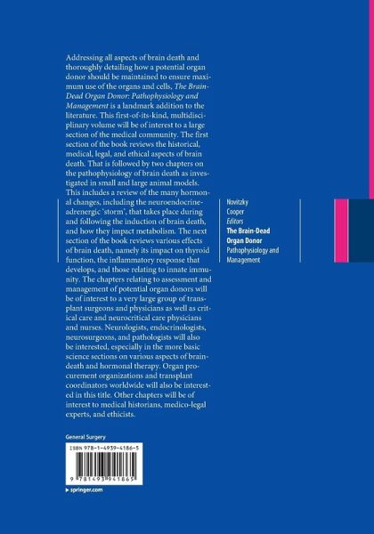 Introduction.- Historical Aspects of the Diagnosis of Death.- The Determination of Brain Death.- Legal Aspects of Declaration of Brain Death and Organ Donation.-Ethical Aspects of Declaration of Brain Death and Organ Donation.- Pathophysiology of Brain Death in Small Animal Models.-Pathophysiology of Brain Death and Effects of Hormonal Therapy in Large Animal Models.-The Efficacy of Thyroid Hormone Therapy in Brain-Dead Heart Donors: A Review of Thyroid Function in Health and Disease.-The Inflammatory Response to Brain Death.- The Influence of Brain Death and Intensive Care Management on Donor Organs: Assessment of Inflammatory Markers.-Brain-Death-Induced Inflammation: Possible Role of the Cholinergic Anti-Inflammatory Pathway.- Innate Immunity and Injury During Brain Death: Opportunities for Intervention.- Selection of the Brain-Dead Potential Organ Donor.- Infectious Disease Aspects of the Brain-Dead Potential Organ Donor.- Malignancy in the Brain-Dead Organ Donor.- EarlyClinical Experience of Hormonal Therapy in the Brain-Dead Potential Organ Donor.- Assessment, Monitoring, and Management of the Brain-Dead Potential Organ Donor.- Assessment, Monitoring and Management of Brain-Dead Potential Organ Donors in Europe.- Current Management of Brain Dead Donors in Australia.- Management of the Brain-Dead Organ Donor-Perspectives of the Transplant Coordinator.-Surgical Aspects of Thoracic and Abdominal Organ Procurement from Brain-Dead Donors.- Impact of Brain Death on Storage of the Heart.- Impact of Brain Death on Abdominal Organs and Allograft Preservation Strategies.- Functional Repair of Brain Death-Induced Injury.-Functional Repair of Brain-Death-Injured Donor Lungs.- Thyroid Hormone Therapy to the Recipient of a Heart from a Brain-Dead Donor.- Current and Potential Future Trends in the Management of the Brain-Dead Organ Donor.-Maximizing Utilization of the Potential Deceased Donor-The Challenge Continues.
