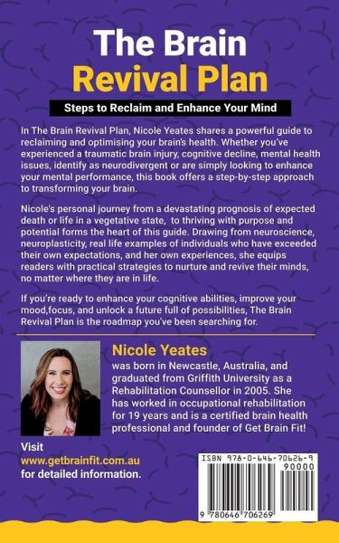 In The Brain Revival Plan, Nicole Yeates shares a powerful guide to reclaiming and optimising your brain's health. Whether you've experienced a traumatic brain injury, cognitive decline, mental health issues, identify as neurodivergent or are simply looking to enhance your mental performance, this book offers a step-by-step approach to transforming your brain. Nicole's personal journey from a devastating prognosis of expected death or life in a vegetative state to thriving with purpose and potential forms the heart of this guide. Drawing from neuroscience, neuroplasticity, real-life examples of individuals who have exceeded their own expectations, and her own experiences, she equips readers with practical strategies to nurture and revive their minds, no matter where they are in life. If you're ready to enhance your cognitive abilities, improve your mood and focus, and unlock a future full of possibilities, The Brain Revival Plan is the roadmap you've been searching for.
