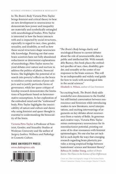 In The Brain's Body Victoria Pitts-Taylor brings feminist and critical theory to bear on new development in neuroscience to demonstrate how power and inequality are materially and symbolically entangled with neurobiological bodies. Pitts-Taylor is interested in how the brain interacts with and is impacted by social structures, especially in regard to race, class, gender, sexuality, and disability, as well as how those social structures shape neuroscientific knowledge. Pointing out that some brain scientists have not fully abandoned reductionist or determinist explanations of neurobiology, Pitts-Taylor moves beyond debates over nature and nurture to address the politics of plastic, biosocial brains. She highlights the potential of research into poverty's effects on the brain to reinforce certain notions of poor subjects and to justify particular forms of governance, while her queer critique of kinship research demonstrates the limitations of hypotheses based on heteronormative assumptions. In her exploration of the embodied mind and the "embrained" body, Pitts-Taylor highlights the inextricability of nature and culture and shows why using feminist and queer thought is essential to understanding the biosociality of the brain.
