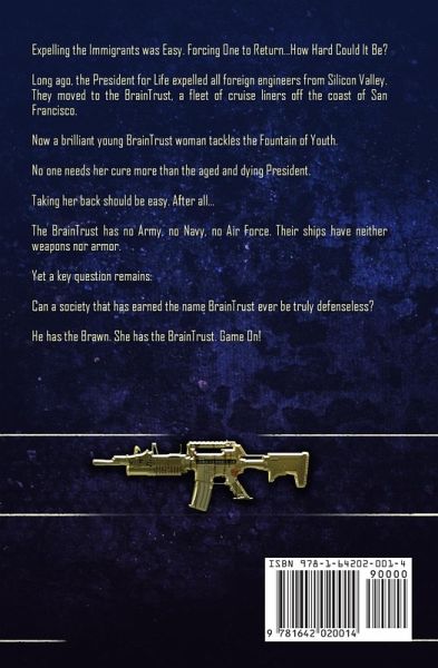 If you really like Donald Trump, do not read this book. The BrainTrust was first built to be home for all the Silicon Valley immigrant engineers expelled by the Red government. With its growing fleet of cruise liners anchored far off the coast of San Francisco, it has become the source of many of Earth's innovations. Innovations that threaten the dogmas of every power bloc in the world. As the BrainTrust's uneasy peace with the Reds, Greens and Blues unravels, the brilliant young researcher Dr. Dash arrives with plans to take the first step toward a cure for aging. Crisis follows on her heels: the man who most needs Dash's therapy is the American President for Life. His Chief Advisor will stop at nothing to grab the cure and the young scientist herself. Dash soon finds her fate inextricably bound with the fate of the BrainTrust itself. The BrainTrust has no Army, no Navy, no Air Force. Their ships have neither weapons nor armor. Yet a key question remains: can a society that has earned the name BrainTrust ever be truly defenseless?Now a 2017 Prometheus Award Nominee! If you like Heinlein's "Moon is a Harsh Mistress", or Vinge's "Peace War", or if you simply want to explore the consequences of a future based on today's radicalized versions of America, welcome to the BrainTrust.