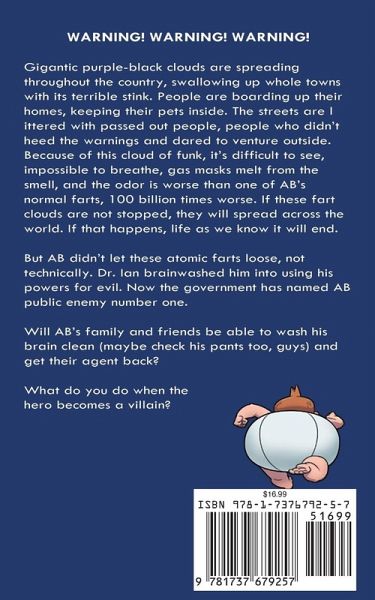 WARNING! WARNING! WARNING! Gigantic purple-black clouds are spreading throughout the country, swallowing up whole towns with its terrible stink. People are boarding up their homes, keeping their pets inside. The streets are littered with passed out people, people who didn't heed the warnings and dared to venture outside. Because of this cloud of funk, it's difficult to see, impossible to breathe, gas masks melt from the smell, and the odor is worse than one of AB's normal farts, 100 billion times worse. If these fart clouds are not stopped, they will spread across the world. If that happens, life as we know it will end. But AB didn't let these atomic farts loose, not technically. Dr. Ian brainwashed him into using his powers for evil. Now the government has named AB public enemy number one. Will AB's family and friends be able to wash his brain clean (maybe check his pants too, guys) and get their agent back? What do you do when the hero becomes a villain?