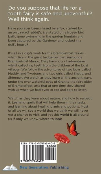 Do you suppose that life for a tooth fairy is safe and uneventful? Well think again. Have you ever been chased by a fox , stalked by an owl, raced rabbit's, ice skated on a frozen bird bath, gone swimming in the garden fountain and been captured by the Gardener and locked in a doll's house? It's all in a day's work for the Bramblefrost fairies, which live in the giant hedgerow that surrounds Bramblefrost Manor. They have lots of adventures whilst collecting teeth from the children of the local villages. We follow the adventures of two boys called Muddy, and Twotone, and two girls called Shade, and Shimmer. We watch as they learn all the ancient ways, under the ever watchful eyes of Granite the fairy elder of Bramblefrost, arts that at one time they shared with us when we had eyes to see and ears to listen. Watch as they learn about nature, and how to respect it. Learning spells that will help them in their tasks, and learning about healing plants and potions. Most of all we will see a world that we think we will never get a chance to visit, and yet this world is all around us if only we know where to look