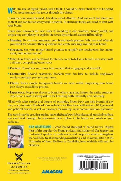 Capture their attention, and keep it. Learn how to stand out in a crowded and distracted world. With the rise of digital media, you'd think it would be easier than ever to be heard. Yet, most messages fail to cut through the clutter. Consumers are overwhelmed. Ads alone aren't effective. And you can't just produce content and connect on every social network. To stand out today, you need to start with your brand. Brand Now uncovers the new rules of branding in our complex and chaotic world. Written by digital strategist and author Nick Westergaard, this book explains how to build brands that resonate both online and off. The book helps you: Create a brand with meaning Reinforce it with the right touchpoints Hone your brand's unique story Share it through engaging content Cultivate a sense of community Craft a coherent experience Stand out with simplicity and transparency The world may be growing louder, but with Brand Now's big ideas and practical toolbox, you can break through the noise-and win a place in the hearts and minds of your customers.