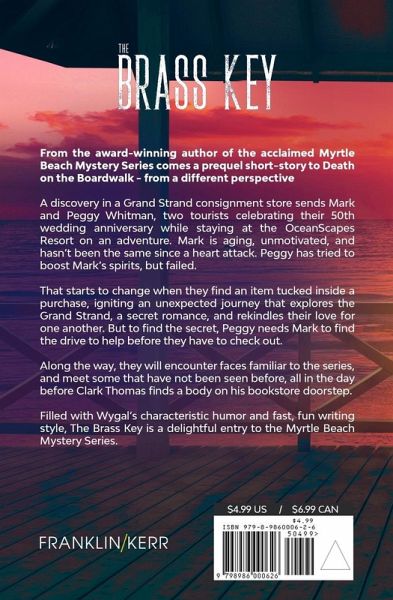 From the award-winning author of the acclaimed Myrtle Beach Mystery Series comes a prequel short-story to Death on the Boardwalk - from a different perspective. A discovery in a Grand Strand consignment store sends Mark and Peggy Whitman, two tourists celebrating their 50th wedding anniversary while staying at the OceanScapes Resort on an adventure. Mark is aging, unmotivated, and hasn't been the same since a heart attack. Peggy has tried to boost Mark's spirits, but failed. That starts to change when they find an item tucked inside a purchase, igniting an unexpected journey that explores the Grand Strand, a secret romance, and rekindles their love for one another. But to find the secret, Peggy needs Mark to find the drive to help before they have to check out. Along the way, they will encounter faces familiar to the series, and meet some that have not been seen before, all in the day before Clark Thomas finds a body on his bookstore doorstep. Filled with Wygal's characteristic humor and fast, fun writing style, The Brass Key is a delightful entry to the Myrtle Beach Mystery Series. - - - - - - - - - - - - - - - - The Brass Key is a prequel short story (all other books in the series are full length novels).