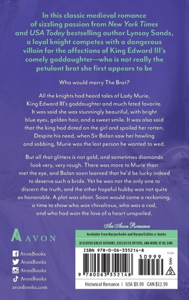 Who would marry the brat? - all the knights had heard tales of Lady Murie, King Edward III's goddaughter and much feted favorite. It was said she was stunningly beautiful, with bright blue eyes, golden hair and a sweet smile. It was also said that the king had doted on the girl and spoiled her rotten. Despite his need, when Sir Balan saw her howling and sobbing, Murie was the last person he wanted to wed. The brat? But all that glitters is not gold, and sometimes diamonds look very, very rough. There was more to Murie than met the eye, and Balan soon learned that he'd be lucky indeed to deserve such a bride. Yet he was not the only one to discern the truth, and the other hopeful hubby was not quite as honorable. A plot was afoot. Soon would come a reckoning, a time to show who was chivalrous, who was a cad and who had won the love of a heart unspoiled. --