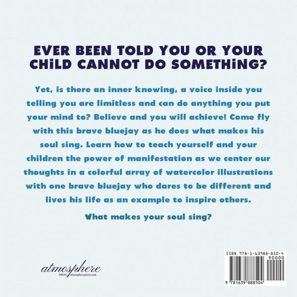 Ever been told you or your child cannot do something? Yet, is there an inner knowing, a voice inside you telling you are limitless and can do anything you put your mind to? Believe and you will achieve! Come fly with this brave bluejay as he does what makes his soul sing. Learn how to teach yourself and your children the power of manifestation as we center our thoughts in a colorful array of watercolor illustrations with one brave bluejay who dares to be different and lives his life as an example to inspire others. What makes your soul sing?