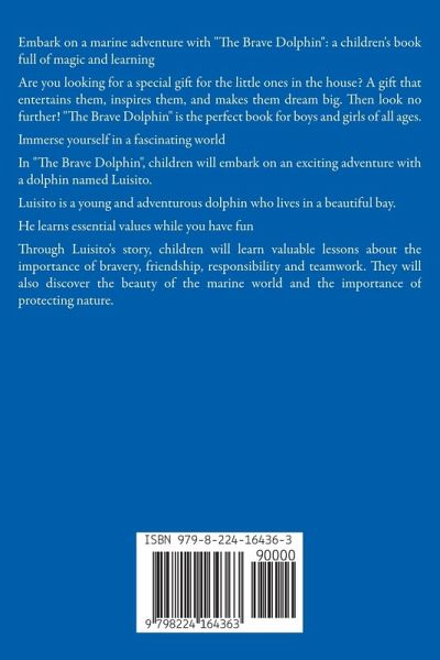 Embark on a marine adventure with "The Brave Dolphin": a children's book full of magic and learning Are you looking for a special gift for the little ones in the house? A gift that entertains them, inspires them, and makes them dream big. Then look no further! "The Brave Dolphin" is the perfect book for boys and girls of all ages. Immerse yourself in a fascinating world In "The Brave Dolphin", children will embark on an exciting adventure with a dolphin named Luisito. Luisito is a young and adventurous dolphin who lives in a beautiful bay. He learns essential values while you have fun Through Luisito's story, children will learn valuable lessons about the importance of bravery, friendship, responsibility and teamwork. They will also discover the beauty of the marine world and the importance of protecting nature. A book that will delight children and adults alike. "The Brave Dolphin" is written in simple and attractive language that children will love. Beautiful, full-color illustrations bring the story to life and transport readers to a magical world full of adventure. A gift that will last a lifetime "The Brave Dolphin" is a book that children can read and enjoy over and over again. It is a perfect gift for birthdays, Christmas, or any special occasion. Don't miss the opportunity to give the little ones an unforgettable reading experience. What makes "The Brave Dolphin" so special? Beautiful Illustrations: illustrations bring the story to life and capture children's imagination. Valuable teachings: The book teaches children important values such as courage, friendship, responsibility, and teamwork. Exciting story: Luisito's adventure is exciting and will keep children hooked until the end. Reading for all ages: "The Brave Dolphin" is written in simple, engaging language that will delight children of all ages. Perfect Gift: The book is an ideal gift for birthdays, Christmas, or any special occasion. "The Brave Dolphin" is a book that children will treasure for a lifetime. Don't miss the opportunity to give them an unforgettable reading experience!