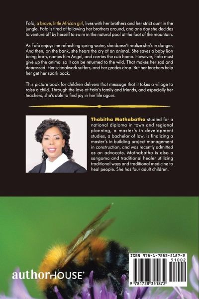 Fofo, a brave, little African girl, lives with her brothers and her strict aunt in the jungle. Fofo is tired of following her brothers around, and one day she decides to venture off by herself to swim in the natural pool at the foot of the mountain. As Fofo enjoys the refreshing spring water, she doesn't realize she's in danger. And then, on the bank, she hears the cry of an animal. She saves a baby lion being born, names him Angel, and carries the cub home. However, Fofo must give up the animal so it can be returned to the wild. That makes her sad and depressed. Her schoolwork suffers, and her grades drop. But her teachers help her get her spark back. This picture book for children delivers that message that it takes a village to raise a child. Through the love of Fofo's family and friends, and especially her teachers, she's able to find joy in her life again.