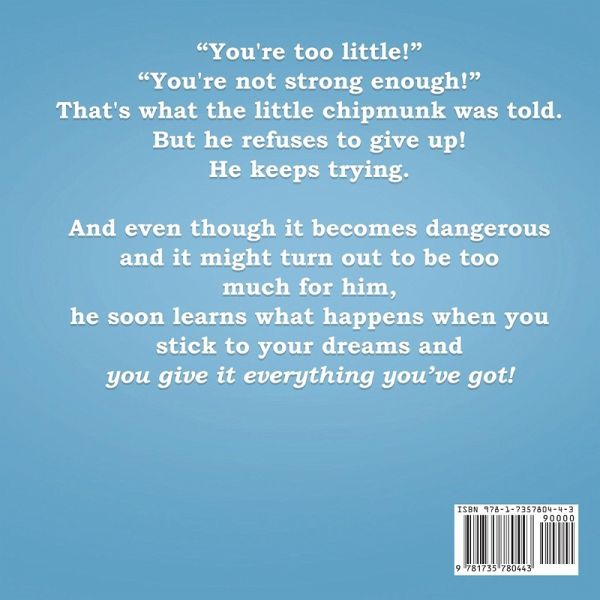 "You're too little!" "You're not strong enough!" That's what the little chipmunk was told. But he refuses to give up! He keeps trying. And even though it becomes dangerous and it might turn out to be too much for him, he soon learns what happens when you stick to your dreams and you give it everything you've got!