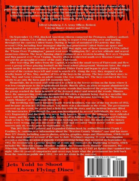 Frank C. Feschino, Jr., the authority of the "Braxton County Monster" incident has returned with an Updated and Expanded version of his 2012 book. His ongoing and diligent 21-year investigation into this case reveals an invasion of gigantic aliens that occurred over America on September 12, 1952. Feschino meticulously reconstructed a timeline of events and recreated the scenario of that terrifying day, which includes the "Flatwoods Monster" and "Frametown Monster" incidents, a massive wave of UFO sightings and crashes and the cover-up of a USAF jet fighter that disappeared that night. This book contains new documentation about the "Braxton County Monster" case and startling UFO events of that day and includes additional witness information, newly discovered sightings, crashes, landings and more. It contains more than 225 visuals, including new articles, photos, maps, graphics and illustrations, which credit Feschino as the world's most thorough investigator of this UFO incident in history.