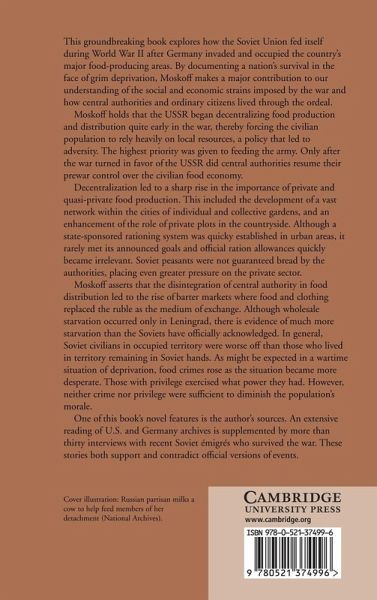 This book tells how the Soviet Union fed itself after the invasion by the Germans during World War II. The author argues that central planning became much less important in feeding the population, and civilians were thereby forced to become considerably more self reliant in feeding themselves. A rationing system was instituted soon after the war began, but quickly became irrelevant because of the chronic food shortages. The breakdown in central supplies of food was accompanied by the diminished importance of the rouble, which in many places was replaced by bread and clothing as the medium of exchange. Although the Soviet army was given high precedence over civilians, the author also shows that the population living under German occupation was much worse off than were Soviet civilians living in the rear. In addition to extensive use of American and German archives from the war period, the author interviewed more than thirty Soviet emigres who survived the war.