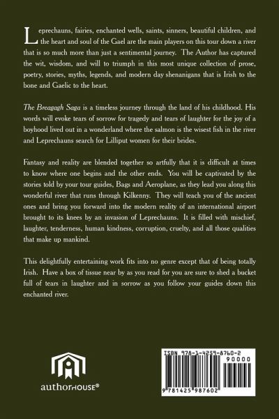 Leprechauns, fairies, enchanted wells, saints, sinners, beautiful children, and the heart and soul of the Gael are the main players on this tour down a river that is so much more than just a sentimental journey. The Author has captured the wit, wisdom, and will to triumph in this most unique collection of prose, poetry, stories, myths, legends, and modern day shenanigans that is Irish to the bone and Gaelic to the heart. The Breagagh Saga is a timeless journey through the land of his childhood. His words will evoke tears of sorrow for tragedy and tears of laughter for the joy of a boyhood lived out in a wonderland where the salmon is the wisest fish in the river and Leprechauns search for Lilliput women for their brides. Fantasy and reality are blended together so artfully that it is difficult at times to know where one begins and the other ends. You will be captivated by the stories told by your tour guides, Bags and Aeroplane, as they lead you along this wonderful river that runs through Kilkenny. They will teach you of the ancient ones and bring you forward into the modern reality of an international airport brought to its knees by an invasion of Leprechauns. It is filled with mischief, laughter, tenderness, human kindness, corruption, cruelty, and all those qualities that make up mankind. This delightfully entertaining work fits into no genre except that of being totally Irish. Have a box of tissue near by as you read for you are sure to shed a bucket full of tears in laughter and in sorrow as you follow your guides down this enchanted river.