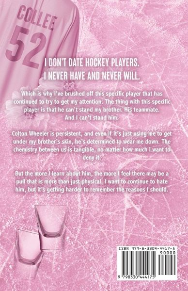 Blurb: I don't date hockey players. I never have and never will. Which is why I've brushed off this specific player that has continued to try to get my attention. The thing with this specific player is that he can't stand my brother. His teammate. And I can't stand him. Colton Wheeler is persistent, and even if it's just using me to get under my brother's skin, he's determined to wear me down. The chemistry between us is tangible, no matter how much I want to deny it. But the more I learn about him, the more I feel there may be a pull that is more than just physical. I want to continue to hate him, but it's getting harder to remember the reasons I should.